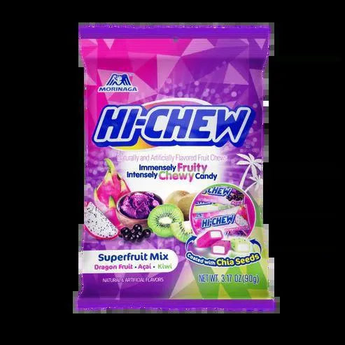 "Hi-Chew Superfruit Mix" is a product line variation of the popular Hi-Chew candy, known for its chewy texture and fruit flavors. This specific mix emphasizes superfruits, which are fruits high in antioxidants, vitamins, and other nutrients. Flavors in the Superfruit Mix might include exotic and nutrient-rich options like acai, dragon fruit, pomegranate, and blueberry, among others. This assortment is designed to offer a delicious, health-conscious snacking option, combining the enjoyable chewy texture of Hi-Chew candies with the bold, natural tastes and supposed health benefits of superfruits. It caters to consumers looking for a sweet treat that also incorporates elements of nutritional value from superfruit ingredients.