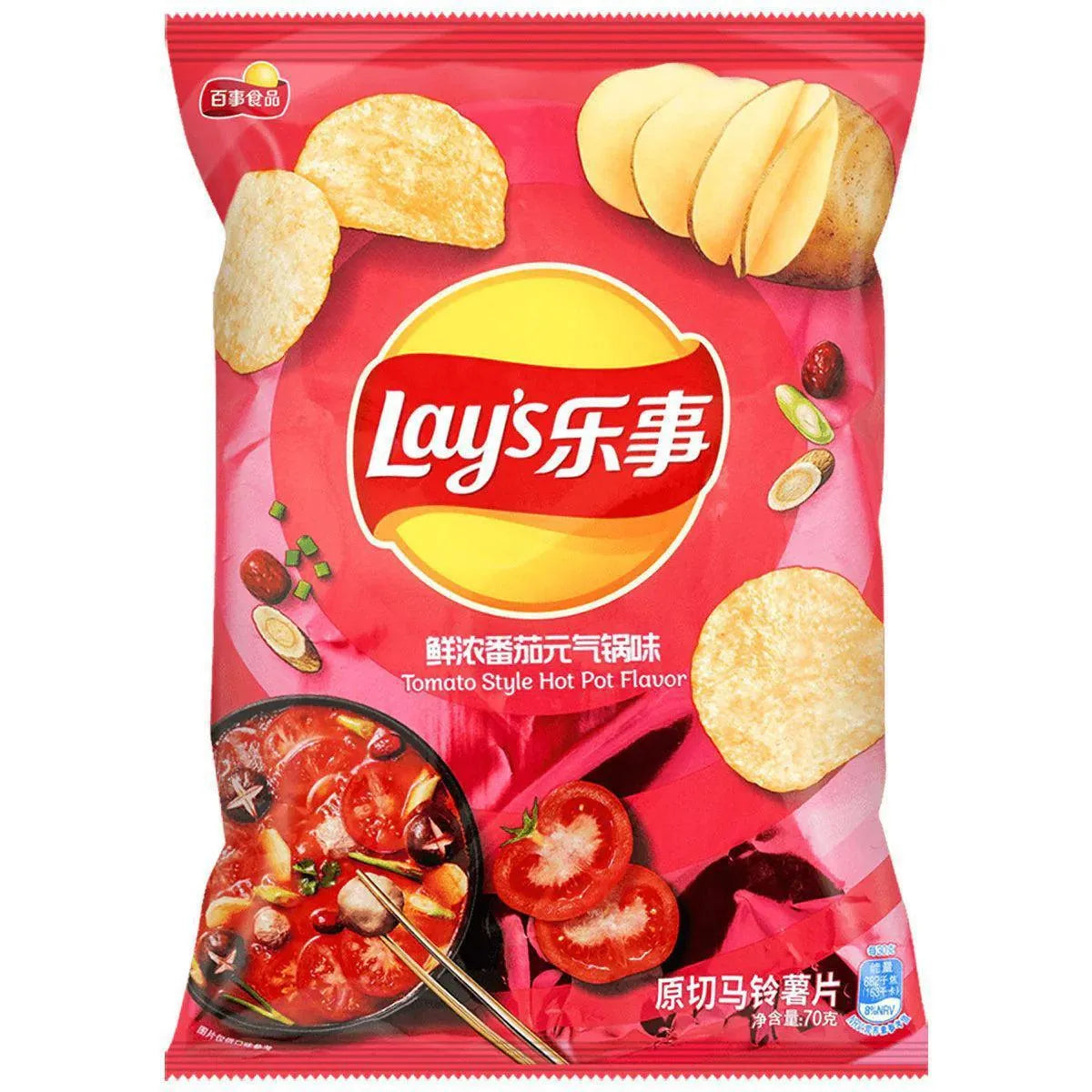 Lay's Chips Tomato Hot Pot Flavor, in a 70g package, are a gourmet twist on the classic Lay's potato chip, inspired by the flavors of a tomato-based hot pot. These chips are seasoned with a blend that captures the tangy, slightly spicy, and savory notes of a tomato hot pot, offering a unique snacking experience that combines the crispy texture of Lay's chips with the warming, complex flavors typical of hot pot cuisine. Perfect for those who appreciate bold, culinary-inspired flavors, these chips bring the communal joy and diverse tastes of hot pot to a convenient, ready-to-eat form, making them a delightful choice for adventurous snackers looking to explore new taste sensations.